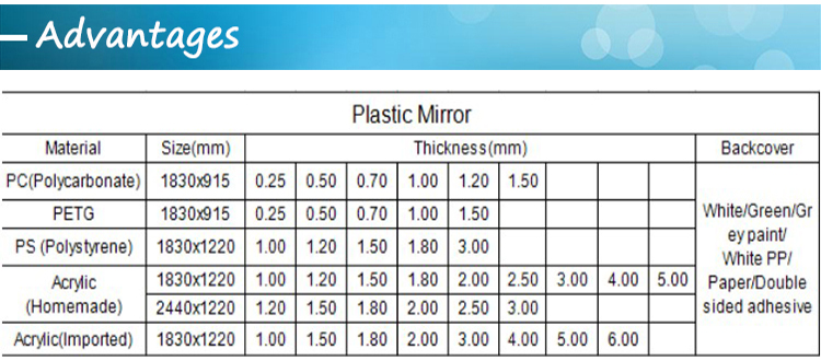 Usage | Decoration / Furniture / Toy / Display panel / Bathroom / Road safety convex mirror / Cosmetics mirror / Advertisement etc. |