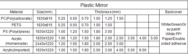 | Usage | Decoration / Furniture / Toy / Display panel / Bathroom / Road safety convex mirror / Cosmetics mirror / Advertisement etc. |