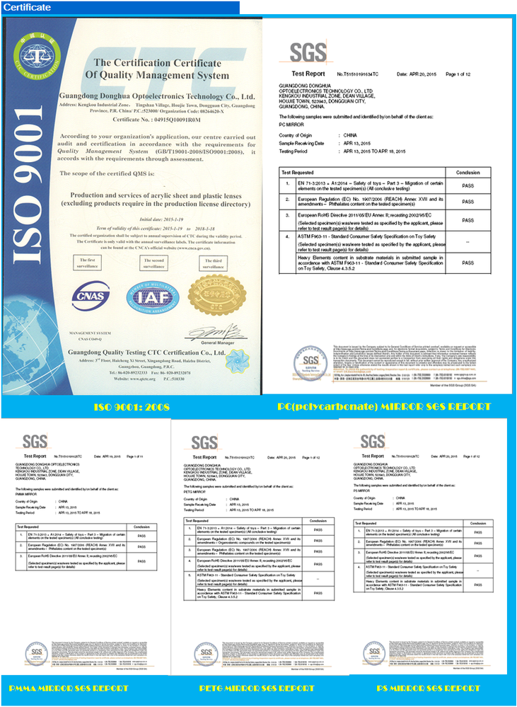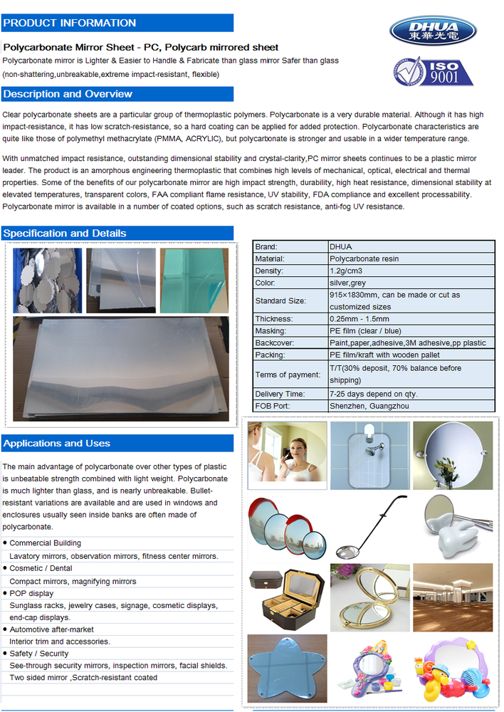 Polycarbonate mirror is Lighter & Easier to Handle & Fabricate than glass mirror Safer than glass (non-shattering,unbreakable,extreme impact-resistant, flexible)